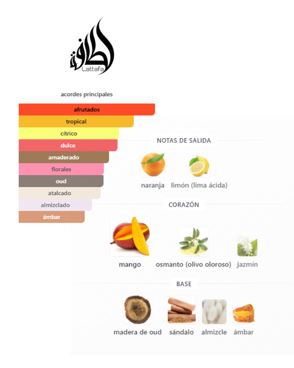 Es una fragancia exótica, fresca y a la vez cálida, con un equilibrio muy interesante entre lo frutal y lo amaderado. La salida es cítrica y luminosa gracias a la naranja y el limón, dando una sensación fresca desde el inicio. En el corazón aparece el mango, que aporta un dulzor tropical jugoso, acompañado por el osmanto y el jazmín que suman un toque floral elegante. El fondo es más profundo y envolvente, con oud, sándalo, almizcle y ámbar, que le dan una base cálida y duradera. Es un perfume versátil, ideal para quienes buscan algo diferente, con un toque tropical pero sofisticado.