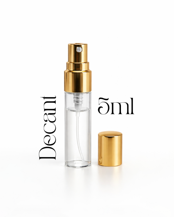 El decant viene en un frasco de vidrio de 5 ml con atomizador, práctico y cómodo de usar. Tiene tapa de metal dorado, con un diseño delicado y elegante, ideal para llevar en la cartera o neceser sin ocupar espacio.