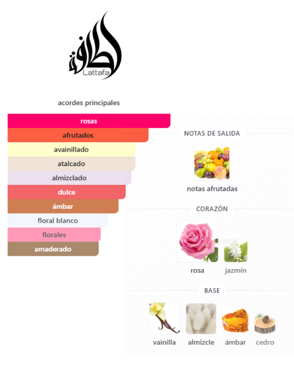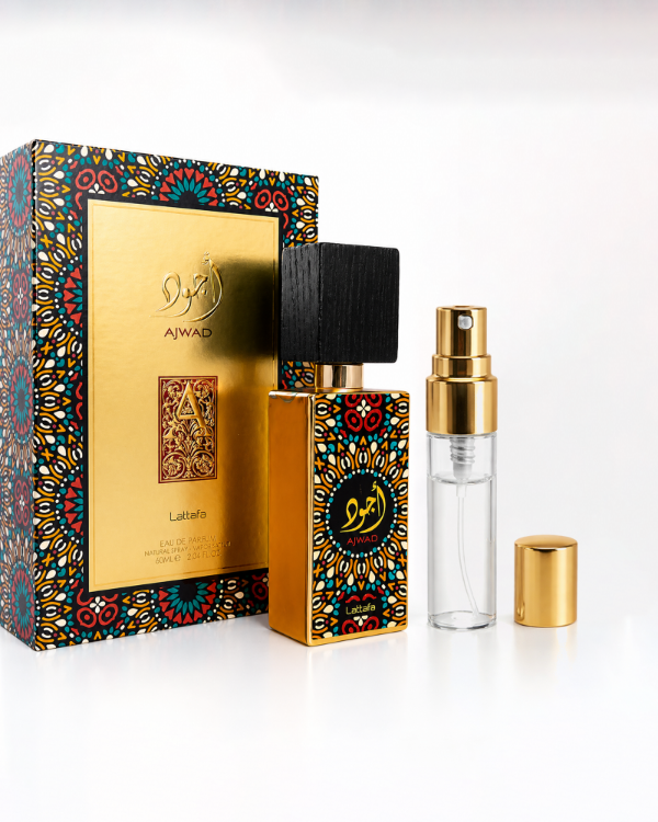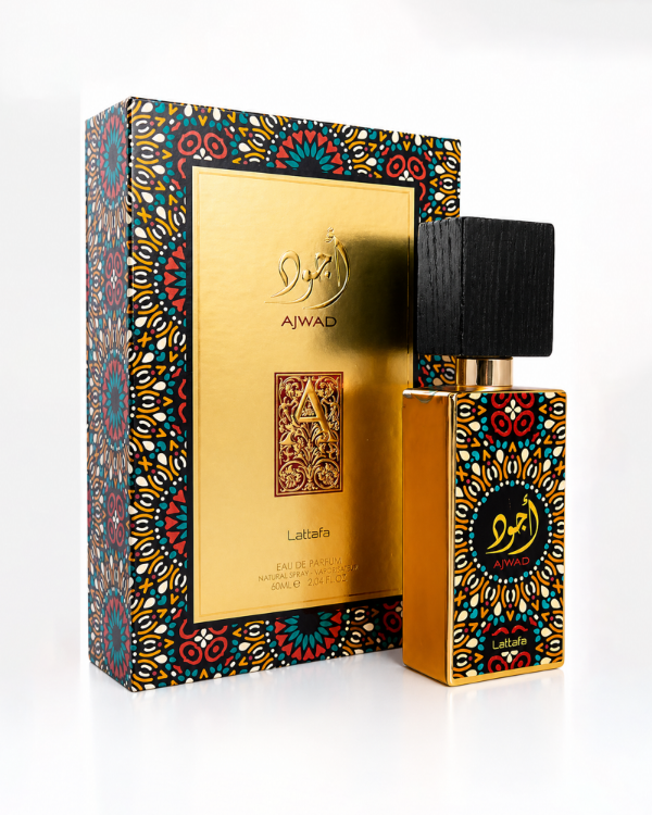 Ajwad es una fragancia equilibrada y versátil, con un perfil dulce, floral y amaderado. La salida es suave y frutal, aportando un inicio fresco y agradable. En el corazón se destacan la rosa y el jazmín, que le dan un toque floral elegante y delicado. El fondo suma calidez con vainilla, almizcle y ámbar, acompañados por el cedro que aporta un leve toque amaderado. Es un perfume fácil de usar, ideal tanto para el día como para la noche, perfecto para quienes buscan algo dulce pero no empalagoso.