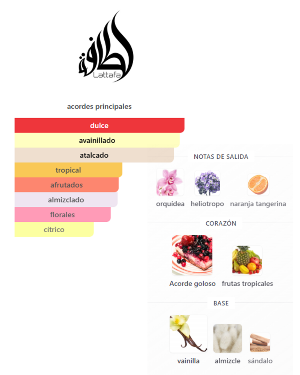 Yara es una fragancia dulce, cremosa y súper femenina, con un perfil gourmand que resulta delicado pero a la vez adictivo. Desde el inicio se siente suave y floral gracias a la orquídea y el heliotropo, con un toque cítrico leve de la mandarina. En el corazón aparecen notas golosas y frutas tropicales que le dan un aire dulce, juvenil y divertido. El fondo es cálido y envolvente, con vainilla, almizcle y sándalo, que aportan cremosidad y una estela suave pero duradera. Es ideal para el día a día o para quienes buscan un perfume dulce pero liviano.